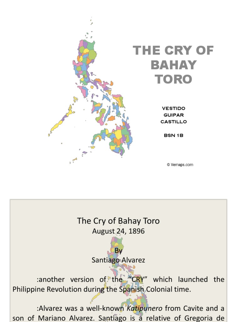 BSN 1B The Cry of Bahay Toro August 24 1896. Four different sources places and dates have been chosen from namely. Bonifacio went outside the hall and talked to the people waiting outside.