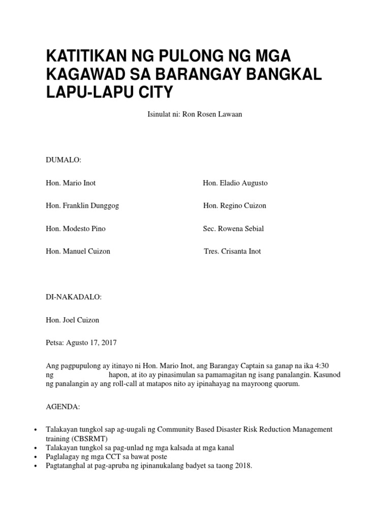 Katitikan Ng Pulong Ng Mga Kagawad Sa Barangay Bangkal Lapu Pdf