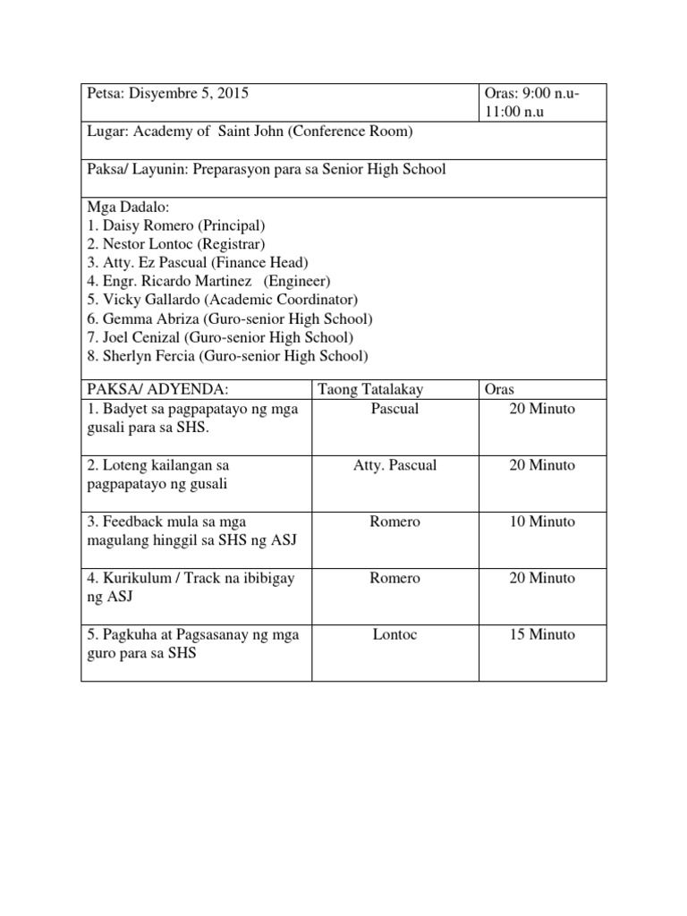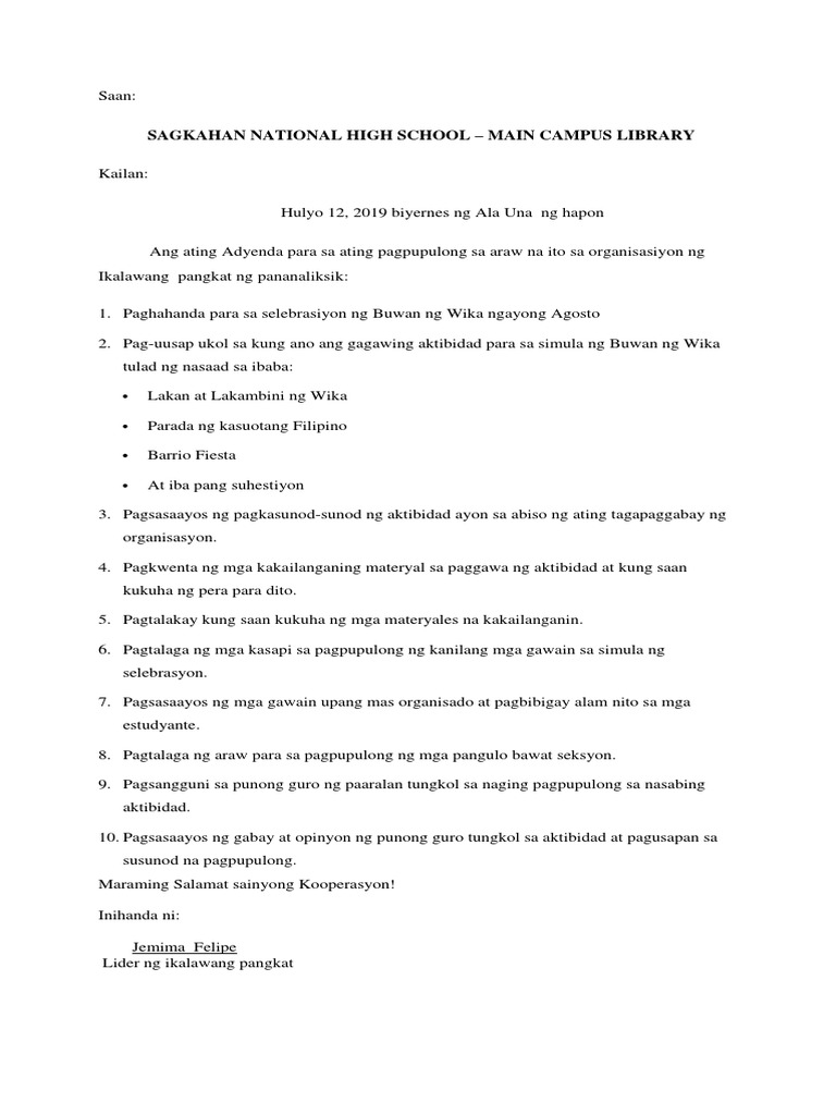 Agenda Halimbawa Docx Republika Ng Pilipinas Kagawaran Ng Edukasyon Pambansang Punong Rehiyon Sangay Ng Lungsod Paaralan Ng Makati Mataas Na Course Hero
