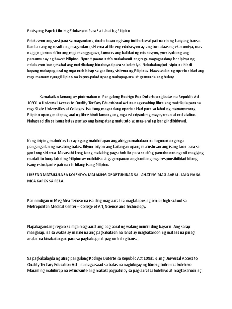 View POSISYONG PAPELdocx from CMC NA at University of the Philippines Diliman. Posisyong papel louis pardo Libreng Edukasyon sa lahat ng Estudyante. Posisyong Papel - Sa paksang ito tatalakayin natin kung ano nga ba ang tinatawag na posisyong papel ang kahulugan nito at mga halimbawa.
