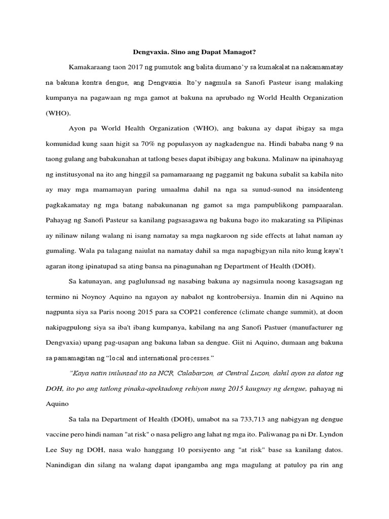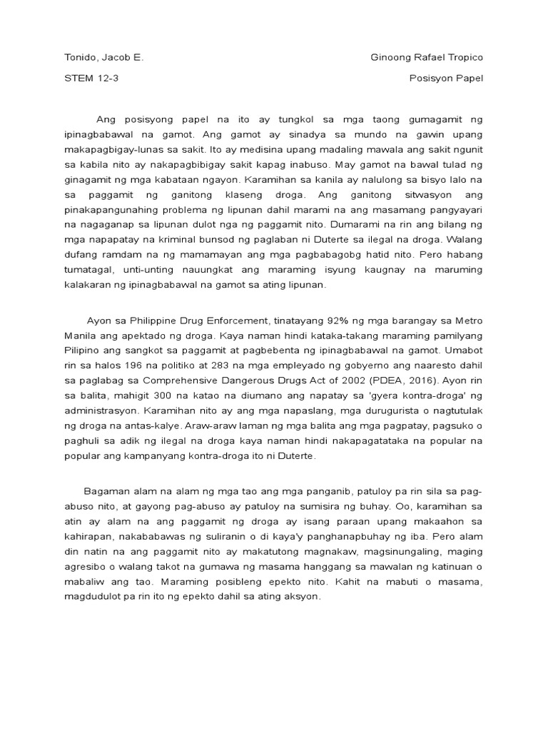 Ito ay isang salaysay na naglalahad ng kuro-kuro hinggil sa isang paksa at karaniwang isinulat ng may akda o ng may entidad gaya ng isang. 37 Full PDFs related to this paper. Dahil sa pagdami ng bilang ng sangkot sa droga dumarami na rin ang mga napapatay dahil sa paglaban sa droga ng isinulong ni Pangulong Duterte.