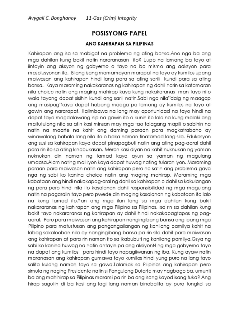 Ang kahirapan ang isa sa mga mabibigat ng problema ng. Proseso sa Pagsulat ng Posisyong Papel. Taong bayan ang ninakawan kaya nararapat lamang na taong bayan din ang dapat umusig sa mga taong.